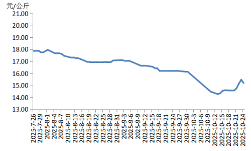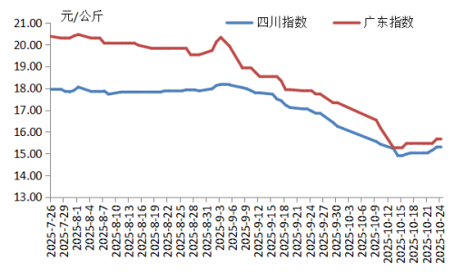本周,四川猪肉周均价为每公斤15.17元,环比上涨1.1%,同比下跌35.9%,较上周跌幅收窄1.3个百分点。规模养殖场出栏节奏放缓,生猪及猪肉供应略减;四川气温明显下降,猪肉消费增加,加之四川省屠宰企业发往华东地区的猪肉订单量增多。供减需增,四川地区猪肉价格小幅上涨。