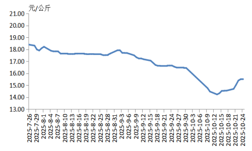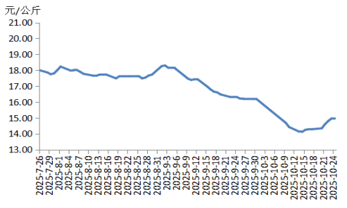 本周华东地区猪肉价格环比上涨。规模养殖场出栏量减少,叠加部分地区专业育肥户将猪源回圈二次增重,截留屠宰企业适重猪源,致使生猪及猪肉供应减少。气温明显下降,猪肉消费增多,屠宰企业销售速度加快,猪肉价格上涨。