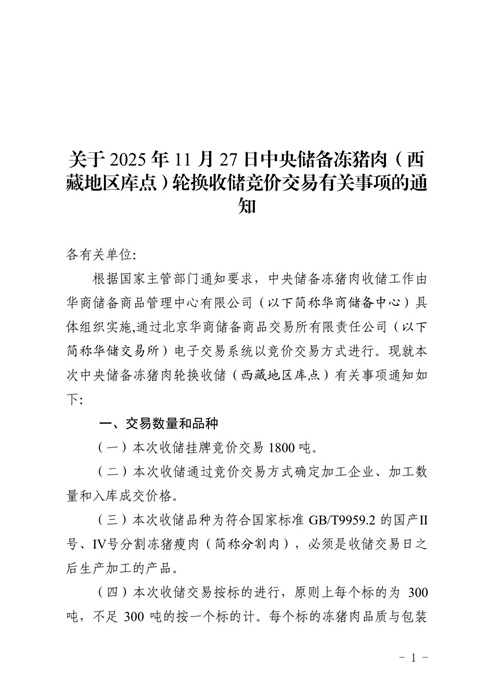 [文]关于2025年11月27日中央储备冻猪肉(西藏地区库点)轮换收储竞价交易有关事项的通知
